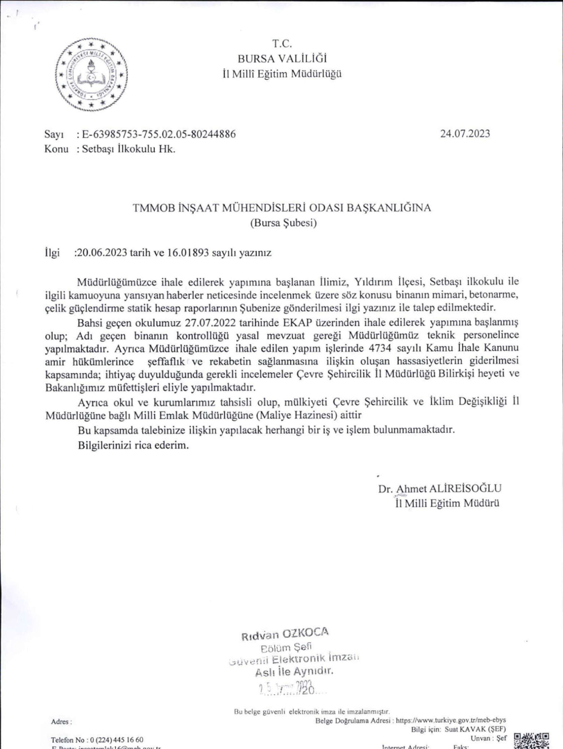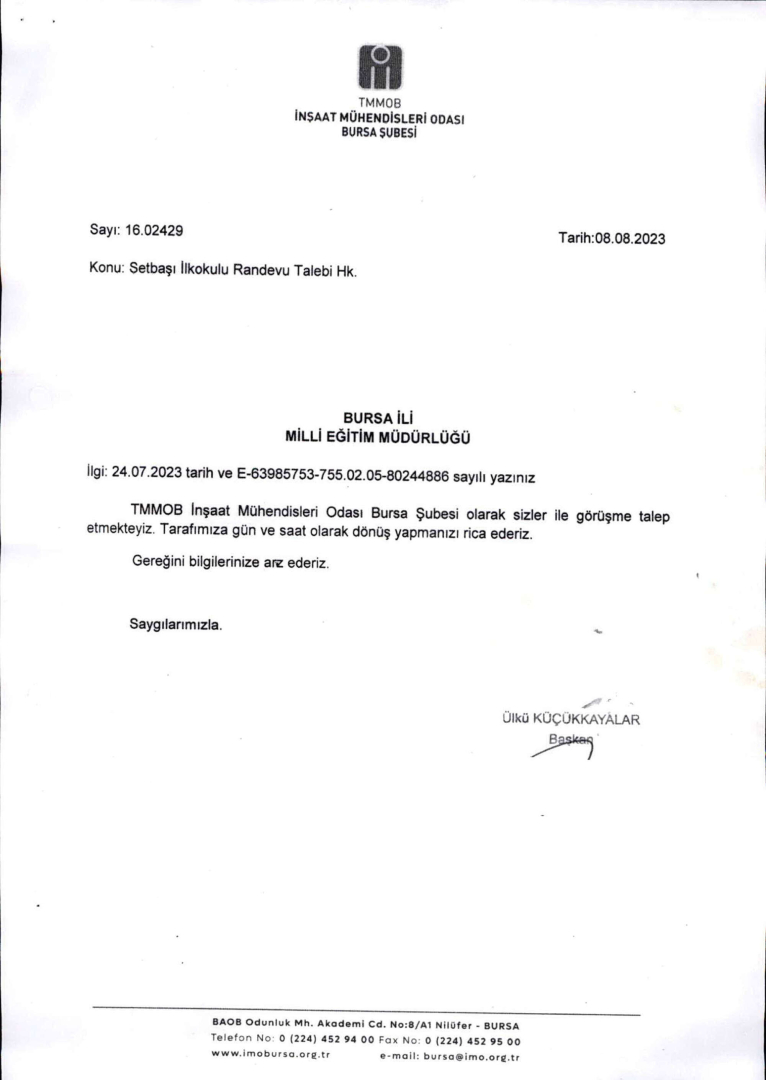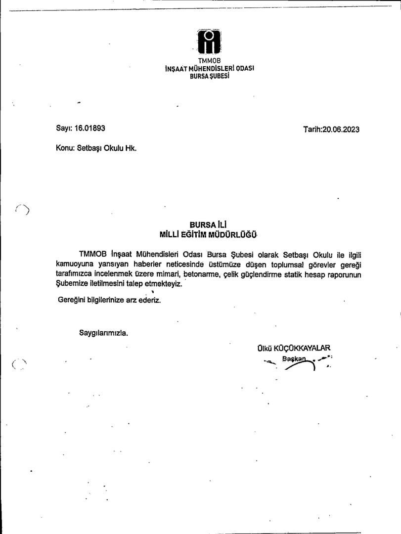 “İnşaat Mühendisleri Odası Bursa Şubesi olarak, toplumun güvenliği ve refahını en üst düzeyde sağlamak için çalışmalarımızı sürdürüyoruz. Bu kapsamda, Setbaşı Okulu'nun yapısının güçlendirilmesine yönelik kamuoyunda yer alan olumsuz iddiaların üzerine araştırma yapma karanı aldık. 20 Haziran 2023 tarihinde, 16.01893 sayılı dilekçemizle, Setbaşı Okulu'nun güçlendirme projeleriyle ilgili olarak, Bursa İl Milli Eğitim Müdürlüğü'nden gerekli bilgi ve belgelerin talebini resmi olarak ilettik. Bu talebimizin arkasındaki neden, medyada yer alan endişeler ve vahim iddialardı. Toplumumuzun güvende olması her şeyden önce gelir ve bu sebeple bu meseleyi yakından inceleme sorumluluğunu üstlendik. Ancak, 24 Temmuz 2023 tarihinde, 80244886 sayılı yazı ile aldığımız cevap, “projelerin bizimle paylaşılmayacağını ve gerekli kontrollerin yapıldığını” belirten bir yanıt içeriyordu. Bunun üzerine, bu önemli konuyu daha fazla anlamak ve çözüm aramak amacıyla Bursa İl Milli Eğitim Müdürlüğü ile yüz yüze bir görüşme talebinde bulunduk. İlk olarak sözlü olarak ilettiğimiz bu talep, 8 Ağustos 2023 tarihinde 16.02429 sayıyla yazılı olarak da iletilmiştir. Ancak ne yazık ki, bu tarih itibariyle bu görüşme talebimize herhangi bir dönüş yapılmamıştır.