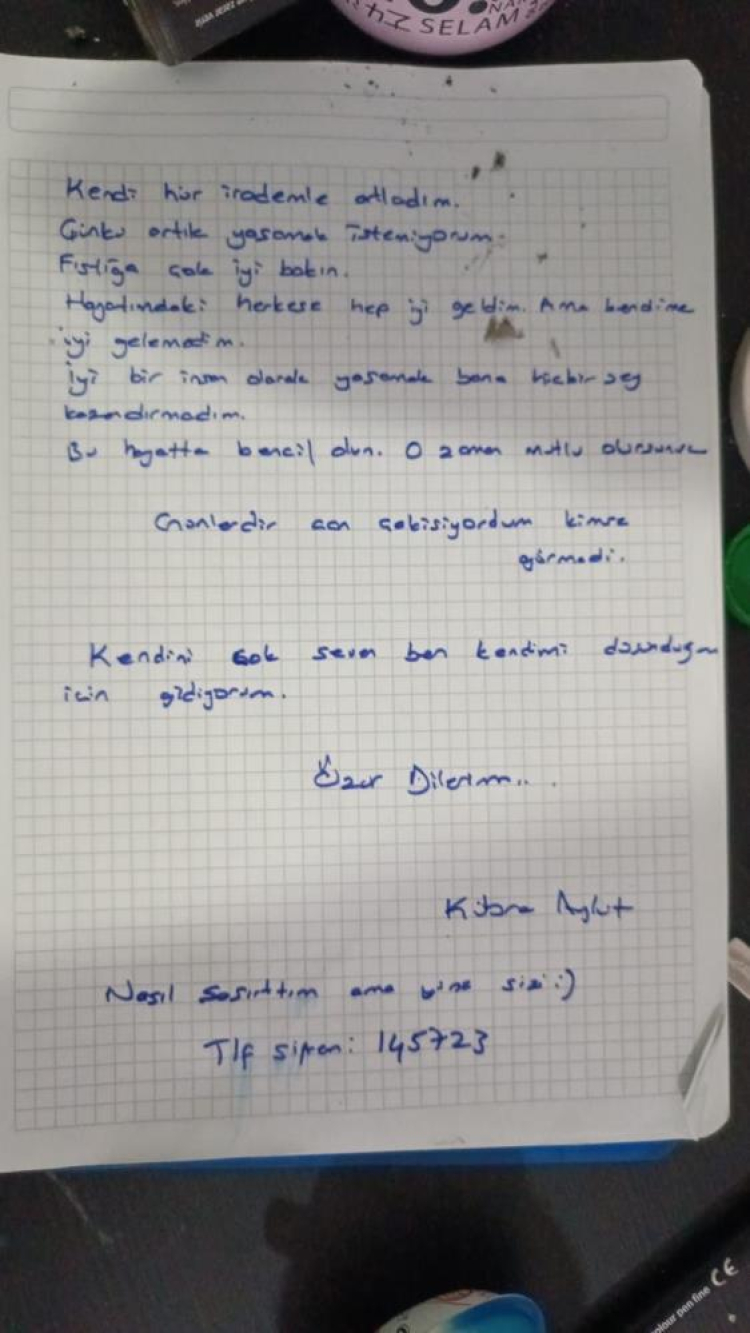 Sosyal medya fenomeni Kübra Aykut, Sultanbeyli’deki evinin 5. katından atlayarak intihar etti. Genç kadının intihar etmeden önce yazdığı veda mektubu ortaya çıktı. Hayatını kaybeden Kübra Aykut veda mektubunda, “Kendi hür irademle atladım. Çünkü artık yaşamak istemiyorum. Fıstığa çok iyi bakın. Hayatımdaki herkese çok iyi geldim. Ama kendime iyi gelemedim. İyi bir insan olarak yaşamak bana hiçbir şey kazandırmadı. Bu hayatta bencil olun. O zaman mutlu olursunuz. Günlerdir can çekişiyordum, kimse görmedi. Kendimi çok seven ben kendimi düşündüğüm için gidiyorum. Özür dilerim. Nasıl şaşırttım ama yine sizi” ifadelerine yer verdi.