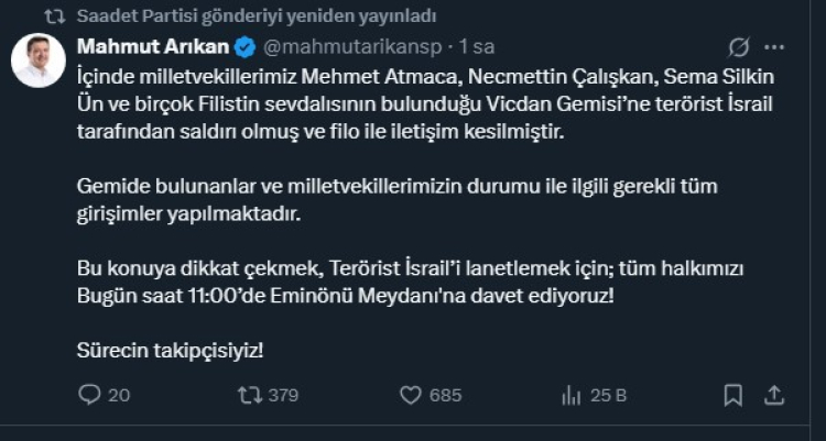 Saadet Partisi Bursa Milletvekili Mehmet Atmaca, Saadet Partisi Hatay Milletvekili Necmettin Çalışkan ve Gelecek Partisi Denizli Milletvekili Sema Silkin Ün, Filistin ablukasını kırmak ve özgürlük mücadelesine destek vermek amacıyla Akdeniz'de seyrederken İsrail güçleri tarafından alıkonuldu.