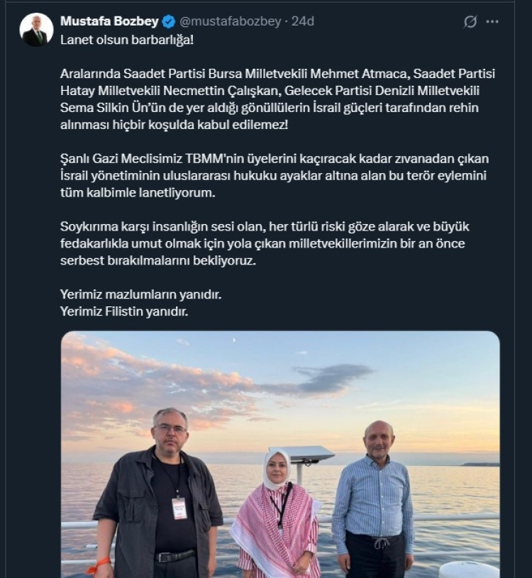 Bozbey açıklamasında; Lanet olsun barbarlığa! Aralarında Saadet Partisi Bursa Milletvekili Mehmet Atmaca, Saadet Partisi Hatay Milletvekili Necmettin Çalışkan, Gelecek Partisi Denizli Milletvekili Sema Silkin Ün’ün de yer aldığı gönüllülerin İsrail güçleri tarafından rehin alınması hiçbir koşulda kabul edilemez! Şanlı Gazi Meclisimiz TBMM'nin üyelerini kaçıracak kadar zıvanadan çıkan İsrail yönetiminin uluslararası hukuku ayaklar altına alan bu terör eylemini tüm kalbimle lanetliyorum. Soykırıma karşı insanlığın sesi olan, her türlü riski göze alarak ve büyük fedakarlıkla umut olmak için yola çıkan milletvekillerimizin bir an önce serbest bırakılmalarını bekliyoruz. Yerimiz mazlumların yanıdır. Yerimiz Filistin yanıdır.