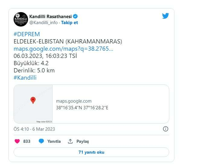 Kandilli Rasathanesi'nden alınan bilgiye göre Kahramanmaraş'ta 4.2 büyüklüğünde deprem meydana geldi.