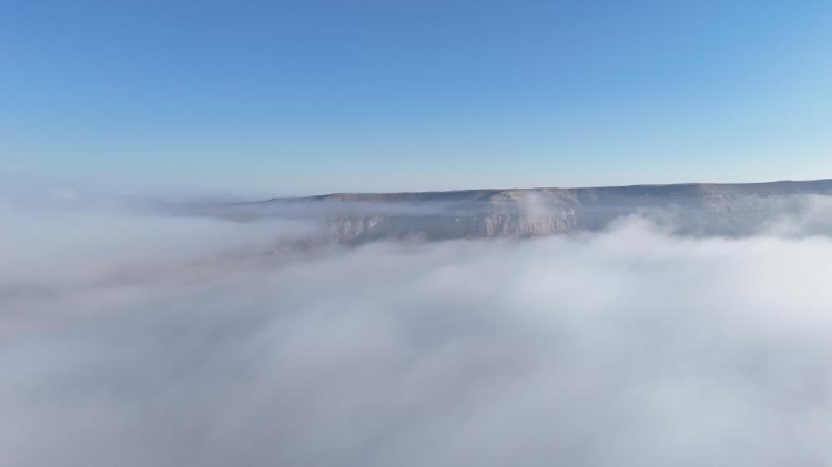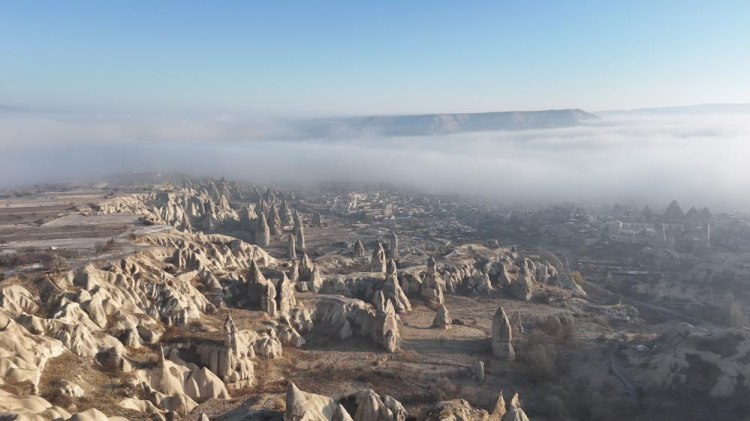 UNESCO Dünya Doğal ve Kültürel Miras Listesi'nde yer alan, Türkiye'nin dünyaca ünlü turizm merkezi Kapadokya, sabahın erken saatlerinde etkili olan yoğun sisle birlikte adeta masalsı bir atmosfere büründü. Peribacaları, vadiler ve sıcak hava balonlarının kalkış alanları sis bulutu altında gizemli görüntüler oluşturdu. O anlar havadan görüntülendi.