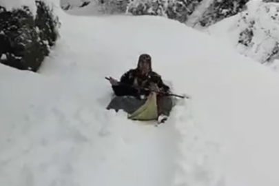 Kastamonu’nun Çatalzeytin ilçesinde 80 santimetreyi bulan kar kalınlığında canı sıkılan teyze, eline aldığı çuvalla kaydı.