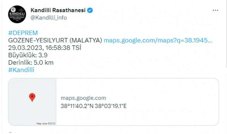 Kandilli Rasathanesi, Malatya'da meydana gelen depremin büyüklüğünü 3.9 olarak açıkladı.