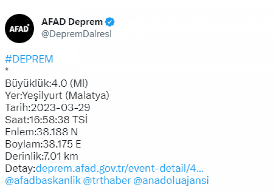 AFAD'dan edinilen bilgiye göre; Malatya'nın Yeşilyurt ilçesinde saat 16.58'de 4.0 büyüklüğünde deprem meydana geldi. Deprem, yerin 7.01 kilometre derinliğinde yaşandı.