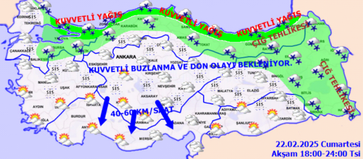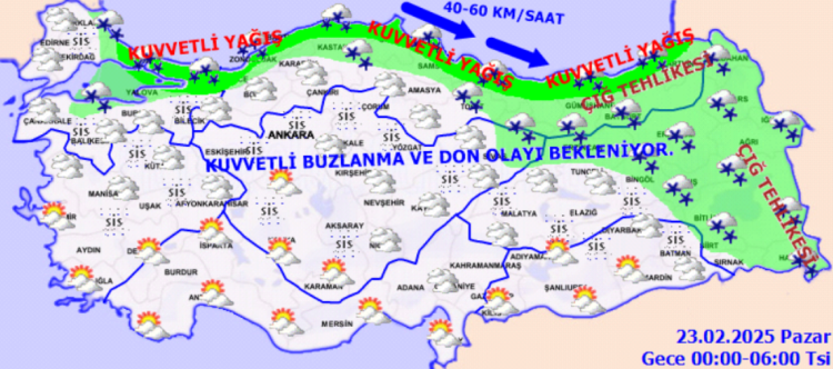 Meteoroloji Genel Müdürlüğünden alınan tahminlere göre yağışların; Karadeniz kıyıları ile Kırklareli kıyıları, İstanbul, Yalova, Kocaeli ve Sakarya çevrelerinde yer yer kuvvetli olması bekleniyor. Kuzey, iç ve doğu kesimlerde kuvvetli olmak üzere Ülkemiz genelinde buzlanma ve don ile birlikte pus ve yer yer sis hadisesinin görüleceği tahmin ediliyor. Doğu Karadeniz’in iç kesimlerinin yüksekleri ile Doğu Anadolu’nun yüksek ve dik yamaçlarında çığ tehlikesi bulunuyor.