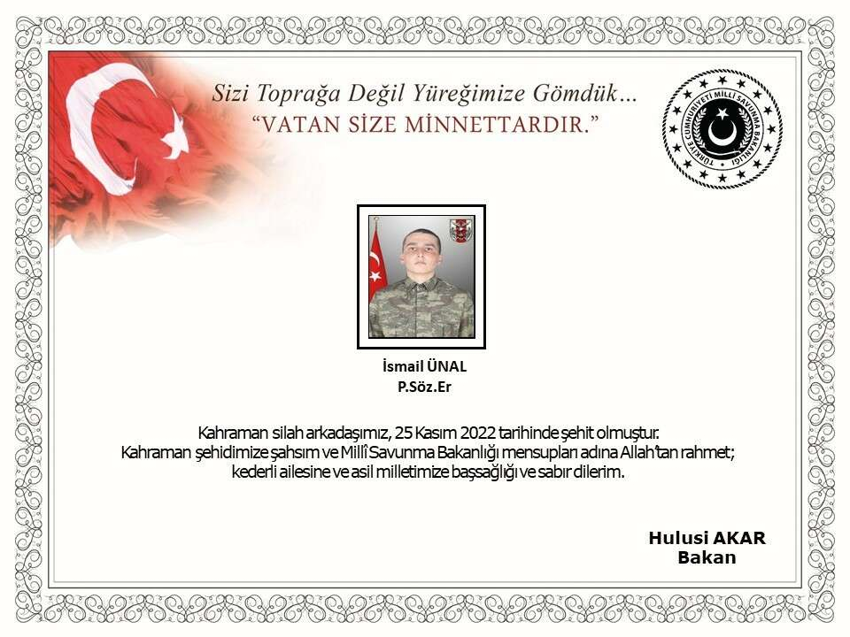 * Bizleri derin bir acı ve üzüntüye boğan bu olayda hayatını kaybeden aziz şehidimize Allah'tan rahmet, kederli ailesine, Türk Silahlı Kuvvetleri ile asil milletimize başsağlığı ve sabır dileriz.”
