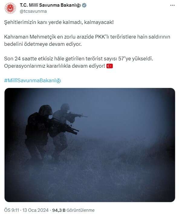 Milli Savunma Bakanlığından yapılan açıklamada, “Şehitlerimizin kanı yerde kalmadı, kalmayacak. Kahraman Mehmetçik en zorlu arazide PKK’lı teröristlere hain saldırının bedelini ödetmeye devam ediyor. Son 24 saatte etkisiz hale getirilen terörist sayısı 57’ye yükseldi. Operasyonlarımız kararlılıkla devam ediyor” ifadelerine yer verildi.
