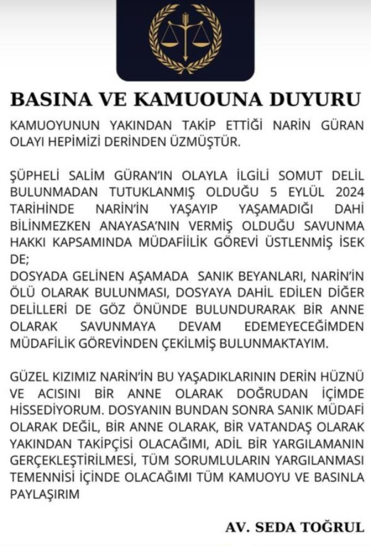 “Kamuoyunun yakından takip ettiği Narin Güran olayı hepimizi derinden üzmüştür. Şüpheli Salim Güran'ın olayla ilgili somut delil bulunmadan tutuklanmış olduğu 5 Eylül 2024 tarihinde Narin'in yaşayıp yaşamadığı dahi bilinmezken anayasanın vermiş olduğu savunma hakkı kapsamında müdafilik görevi üstlenmiş isek de; dosyada gelinen aşamada sanık beyanları, Narin'in ölü olarak bulunması, dosyaya dahil edilen diğer delileri de göz önünde bulundurarak bir anne olarak savunmaya devam edemeyeceğimden müdafilik görevinden çekilmiş bulunmaktayım. Güzel kızımız Narin'in bu yaşadıklarının derin hüznü ve acısını bir anne olarak doğrudan içimde hissediyorum. Dosyanın bundaki sonraki müdafi olarak değil, bir anne olarak, bir vatandaş olarak yakından takipçisi olacağım. Adil bir yargılamanın gerçekleştirilmesi, tüm sorumluların yargılanması temennisi içinde olacağım.”