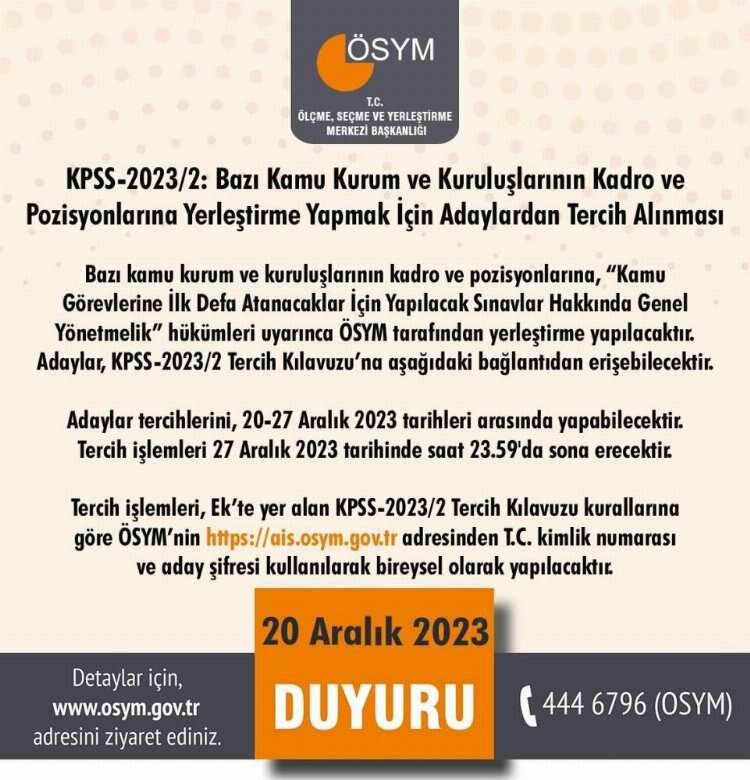 Ölçme, Seçme ve Yerleştirme Merkezi (ÖSYM) Başkanlığı, bazı kamu kurum ve kuruluşlarının kadro ve pozisyonlarına yapılacak yerleştirme için tercihlerin 27 Aralık’a kadar süreceğini bildirdi.