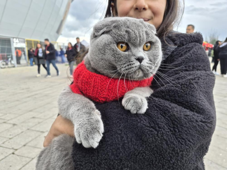 Eskişehirspor taraftarı Arife Masal Sarıtaş, Kütahyaspor maçına siyah-kırmızılı giydirdiği kedisi ile birlikte geldi.