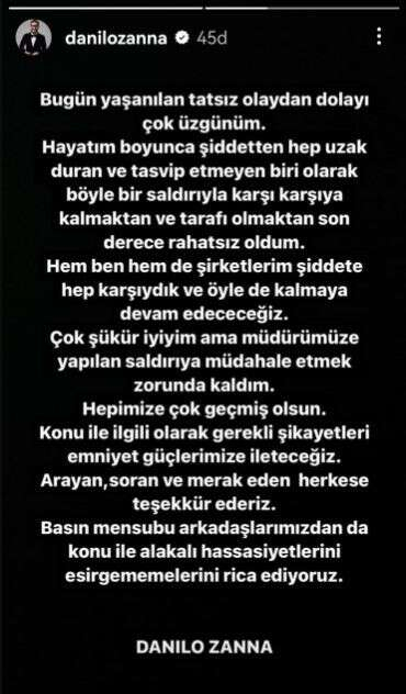 İtalyan şef Danilo Zanna, saldırı olayına ilişkin sosyal medya hesabında yaptığı açıklamada, "Çok şükür iyiyim ama müdürümüze yapılan saldırıya müdahale etmek zorunda kaldım.