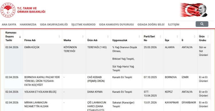 Tarım ve Orman Bakanlığı tarafından kamuoyuyla paylaşılan ‘Taklit veya Tağşiş Yapılan Gıdalar’ listesi güncellendi. 2 Nisan tarihli listede farklı illerde faaliyet gösteren firmalara ait birçok üründe mevzuata aykırılıklar tespit edildi. Listenin ‘Sağlığı Tehlikeye Düşürecek Gıdalar’ kısmında, İstanbul Kağıthane merkezli MMİ İlaç Gıda Kozmetik Sanayi ve Ticaret Limited Şirketi’nde bitkisel veya takviye edici olarak pazarlanan The Jestea Capsul (L-Carnitine içeren takviye edici gıda), Diblong (Ginseng macun), Diblong Ginseng Drink For Men (Tutti Frutti aromalı gazlı içecek), Özlex Tea (Orman meyveli içecek) ürünlerde ilaç etken maddesi tespit edildi. Listenin ‘Aynı Değeri Taşımayan Madde Eklenmesi’ kısmında ise, Antalya’nın Alanya ilçesinde faaliyet gösteren Emin Küçük’e ait ‘Köyünden Tereyağı (1 kilogram)’ ürününde yağ oranının düşük olduğu, bitkisel yağ ve süt yağı harici yağ tespiti yapıldığı belirlendi.