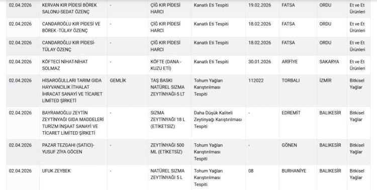 Ordu’nun Fatsa ilçesinde faaliyet gösteren Kervan Kır Pidesi Börek Salonu (Sedat Özenç) ile Candaroğlu Kır Pidesi ve Börek (Tülay Özenç) işletmelerine ait çiğ kır pidesi harçlarında kanatlı eti tespit edildi.