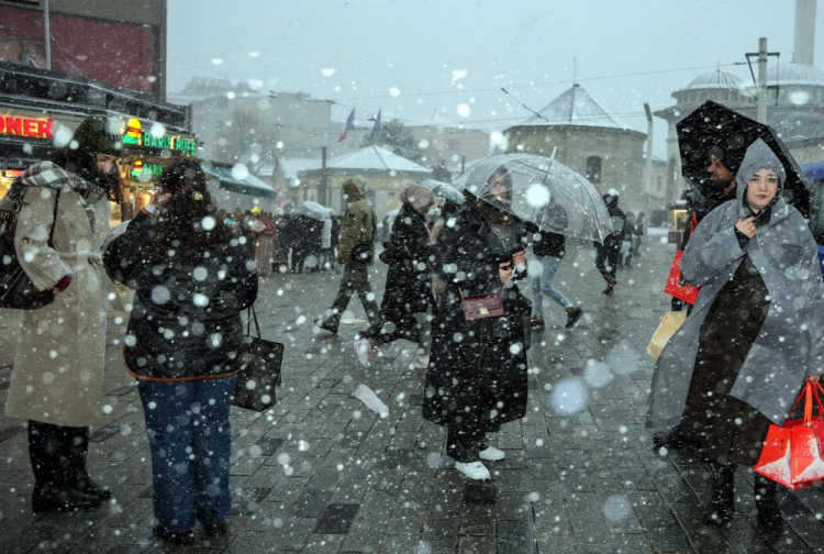 Şiddetini artıran kardan bazı yerli ve yabancı turistlerin şemsiyelerle korunduğu ve fotoğraf çektirdikleri görüldü.