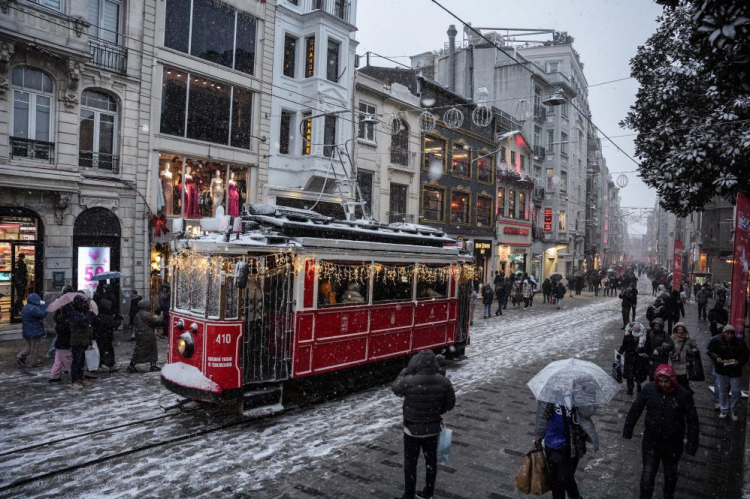 Megakentin turistik mekanlarından olan Taksim ve İstiklal Caddesi'nde yerli ve yabancı turistler yoğun kar yağışı altında yürüdü.