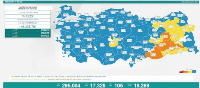 Sağlık Bakanlığı 18 Mart koronavirüs tablosunu açıkladı. Türkiye'de son 24 saatte 17.328 yeni vaka tespit edilirken, 105 kişi hayatını kaybetti.