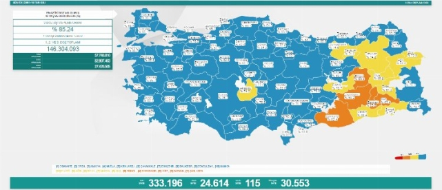 Sağlık Bakanlığı tarafından Türkiye'nin yeni korona virüs tablosu açıklandı. 15 Mart'ta açıklanan 24 saatlik verilere göre, 24 bin 614 vaka tespit edildi. Virüs nedeniyle hayatını kaybedenlerin sayısı 115 oldu. Bir günde toplam 333 bin 196 test yapılırken, iyileşen hasta sayısı 30 bin 553 olarak kaydedildi.