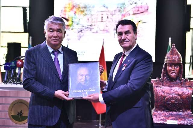TÜRKSOY Genel Sekreteri Sultan Raev, Başkan Dündar’a teşekkür belgesi ile birlikte Cengiz Aytmatov albümü hediye etti.