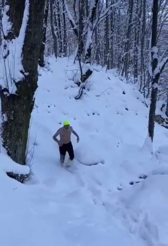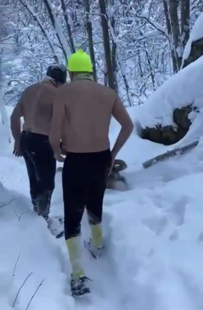 Bursa’da iki arkadaş dondurucu soğukta kar yağışını fırsata çevirdi. Uludağ'ın eteklerindeki ormanlık alanda kar banyosu yapan iki kafadar soğuğa meydan okudu.