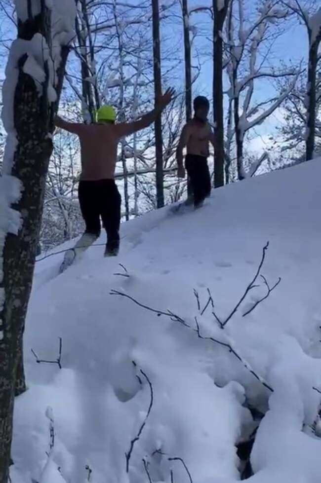 Hava sıcaklığının -5 dereceleri kadar gördüğü Zeyniler’de iki arkadaş bone takarak yarı çıplak bir şekilde karın tadını çıkardılar. İki kafadar yarı çıplak şekilde kara gömüldüler, zaman zamanda karda koşarak kara atladılar.