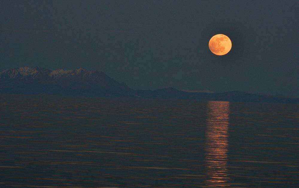 Bitlis’in Ahlat ilçesinde Van Gölü üzerinde yükselen dolunay görsel şölen oluşturdu.