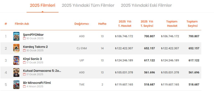 Box Office Türkiye internet sitesi, 2025 yılında çıkan filmler arasında ilk sıranın Şampiyonlar filmi olduğunu açıkladı.
