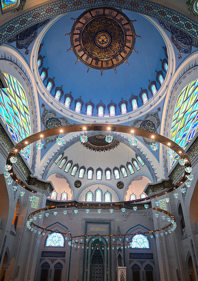 Ana kubbe yazısını çevreleyen desenler gemi dümeni şeklinde yapıldı. Kubbe yazısının tam ortasında 16 köşeli pusula yıldızı yer alıyor. Büyük Çamlıca Camisi'ndeki ana kubbede olduğu gibi nano teknolojinin kullanıldığı camide, masif bakır levhalar ile altın ve gümüş renkli malzemeler yer alıyor.