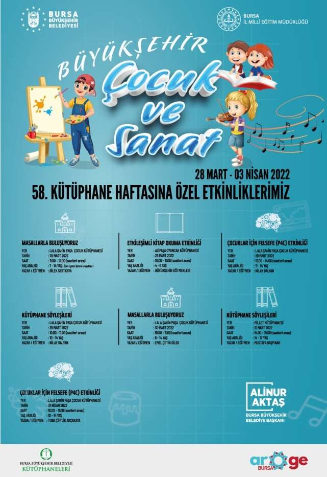 Lala Şahin Paşa Çocuk Kütüphanesi, Alipaşa Oyuncak Kütüphanesi ve Millet Kütüphanesi’ndeki programlarda; Masallarla Buluşuyoruz, Etkileşimli Kitap Okuma, Çocuklar için Felsefe ve Kütüphane Söyleşileri etkinlikleri gerçekleştirilecek.