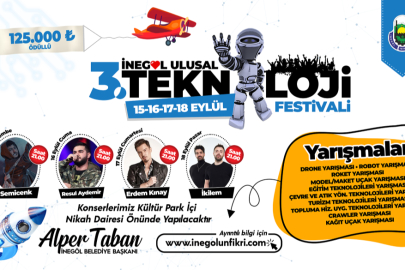 İnegöl Belediyesi, özellikle gençlerin yoğun katılım gösterdiği 3. İnegöl Ulusal Teknoloji Festivali ile yazın son günlerinde şehre büyük coşku yaşatacak. 15 Eylül Perşembe günü başlayacak olan festival, 18 Eylül Pazar akşamına kadar sürecek. 3. İnegöl Ulusal Teknoloji Festivali, ilk 2 yılında olduğu gibi bu yıl da birbirinden değerli yarışmalar, konserler, gösteriler ve söyleşilerin yer alacağı eğlence ve bilimin aynı merkezde buluştuğu bir organizasyon olacak. Aynı zamanda ülkemizin yerli ve milli teknoloji hamlesi doğrultusunda Yerel Yönetimler düzeyinde konsepti ile bir ilk olan festivalin ilk günü gündüz saatlerinde; Robot yarışması 1. Turu, Eğitim Teknolojileri Yarışması ve açılış töreni gerçekleştirilecek. Akşam 20.00’da Kariyer söyleşisi ile devam edecek festivalde, 21.30’da ise Semicenk sahne alacak. İlk günün finali konserle gerçekleştirilecek. 16 Eylül Cuma günü drone yarışması, roket yarışması, robot yarışması 2. Turu ve çevre atık yönetimi yarışmasının yapılacağı festivalde, yine 20.00’da kariyer söyleşisi olacak. 2. Günün finalinde de 21.30’da Resul Aydemir sahne alacak. 17 Eylül Cumartesi günü; kağıt uçak yarışması, model uçak yarışması, topluma hizmet uygulamaları teknolojileri yarışması gerçekleştirilecek. Akşam 20.00’da kariyer söyleşisi ile devam edecek festivalde 3. Günün finali Erdem Kınay konseriyle yapılacak. Teknoloji Festivalinin final gününde turizm teknolojisi yarışmaları, drone yarışması ve crawler yarışması gerçekleştirilecek. 20.00’da yapılacak kariyer söyleşisinin ardından 21.30’da İkilem konseri ile final yapılacak. Festival kapsamında yapılan yarışmalarda, toplamda 125 bin TL ödül dağıtılacak.