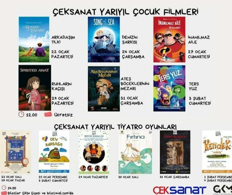 ÇEKSANAT, atölyelerin yanı sıra Uludağ Sinema Topluluğu tarafından çocuklara özel hazırlanan program ile ücretsiz “Sinema” gösterimleri gerçekleştirecek. “Arkadaşım Tilki”, “Denizin Şarkısı”, “İnanılmaz Aile”, “Spirited Away”, “Ateş Böceklerinin Mezarı” ve “Ters Yüz” filmleri yarı yıl tatili boyunca pazartesi- çarşamba ve cumartesi günleri saat 12.00’de GKM Sinema Salonu’nda çocukları bekliyor olacak.