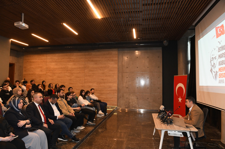 İstiklal Marşı’nın Kabulü ve Mehmet Akif Ersoy’u Anma Programı’na konuşmacı olarak Dr. Öğretim Üyesi Yusuf Ziya Karaaslan katıldı. Mehmet Akif’in hayatı hakkında bilgiler vererek konuşmasına başlayan Karaaslan, milli şairin ülkenin zorda olduğu dönemde önemli işler yaptığına vurgu yaptı. Ersoy’u daha iyi tanımayı ve anlamayı amaçlayan bir konuşma yapan Karaaslan, “Mehmet Akif Ersoy, Milli Mücadele’nin en önemli isimlerinden bir tanesidir. Yazmış olduğu İstiklal Marşı ile milletin birlik ve bütünlüğüne ve de düşmana karşı savaşma motivasyonuna büyük oranda etkide bulunmuştur. Mustafa Kemal Atatürk, Milli Mücadele’nin kahramanı ve lideriyken, Mehmet Akif de İstiklal Marşı ve yazdığı diğer şiirler ile toplumu örgütleyen, topluma birlik ve mücadele aşkı sağlayan manevi bir lider olmuştur. Mehmet Akif’in şiirleri günümüzde de milli ve manevi değerler hususunda aklımızda ve zihnimizde olmaya devam ediyor” dedi.