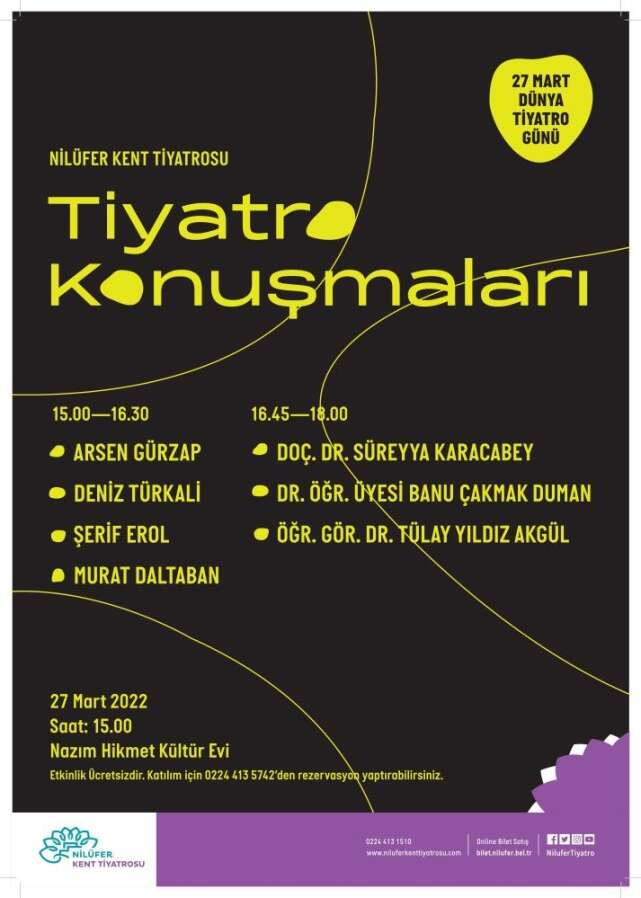 27 Mart Dünya Tiyatro Günü’nde Nilüfer’de tiyatro konuşulacak. Nilüfer Kent Tiyatrosu 27 Mart’ta düzenleyeceği “Tiyatro Konuşmaları”nda kendilerini tiyatroya adayan değerli isimler ve akademisyenleri tiyatro meraklıları ile buluşturacak.