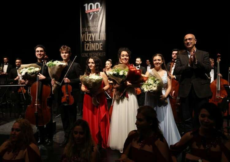Şef Deniz Tan yönetiminde sahne alan dev orkestrada, genç yetenekler solist olarak yer aldı. Piyanoda Yaprak Özgüç, Melis Topçular, Göksu Yıldız, kemanda Atakan Atasoy ve viyolada Efe Oğul Çakal ilk defa böyle bir gecede performans sergiledi. Mozart, Bach ve H. Wieniawski gibi dünyaca ünlü bestecilerin eserlerini başarıyla sergileyen genç yetenekler ayakta alkışlandı. Konserin son bölümünde ise Nilüfer Oda Orkestrası’na Nilüfer Çoksesli Koro da eşlik etti. Vatan Marşı, Gençlik Marşı ve Cumhuriyet’in 100. Yıl Türküsü’nü birlikte seslendiren iki koro izleyenlere büyük mutluluk ve gurur yaşattı. Konser sonunda Nilüfer Belediyesi Başkan Yardımcısı Remzi Çınar, Başkan Turgay Erdem adına şefler Deniz Tan, Z. Göknur Yıldız ve solistlere çiçek verdi.