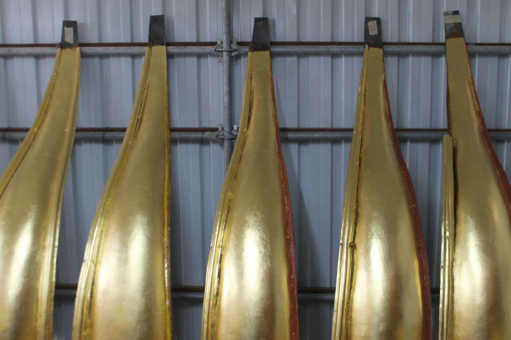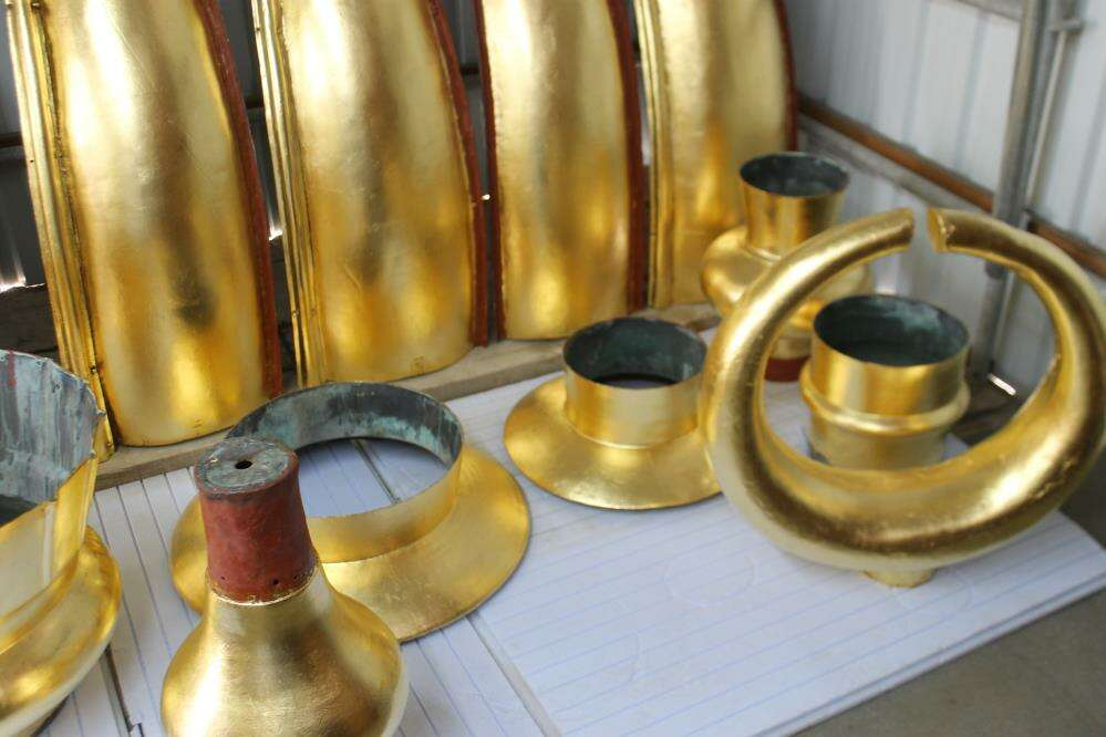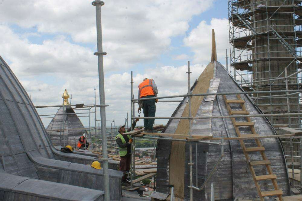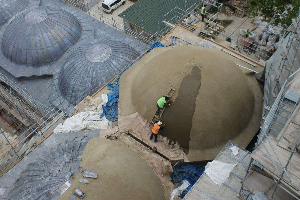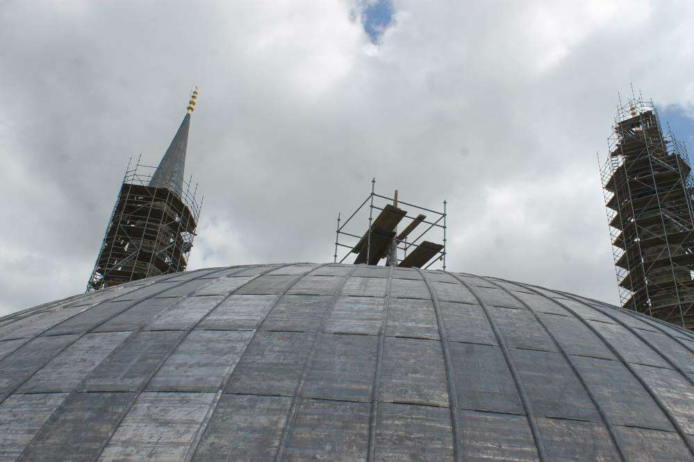 Kubbenin kurşun kaplaması işleminden önce çıkarılan bakır alem, temizlik çalışmalarının ardından onarıldı. Altın varak ile kaplanan yaklaşık 700 kilogram ağırlığında, 6 metre 30 santimetre yüksekliğindeki alem, kubbeye taşınarak yerinde montajlanıyor.