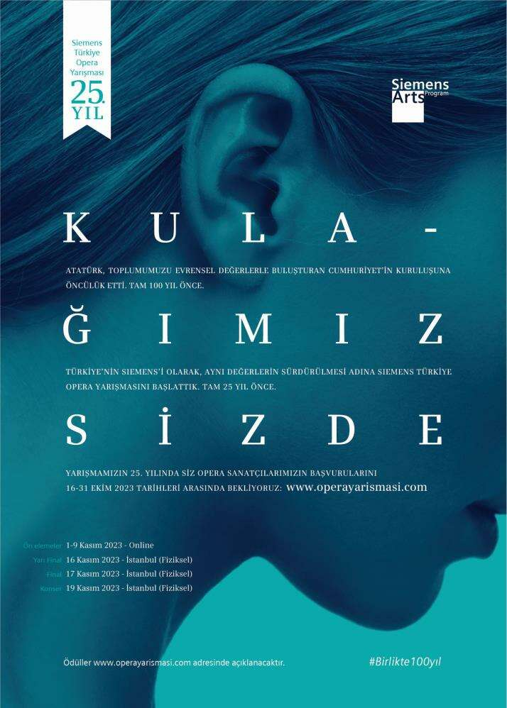 Siemens Türkiye’nin 25 yıldır sürdürdüğü ‘Siemens Türkiye Opera Yarışması’ için başvuru dönemi başlıyor. Cumhuriyet’in 100. yılında ‘Kulağımız Sizde’ mottosuyla düzenlenen yarışmaya katılmak isteyen genç opera sanatçılarının 16-31 Ekim tarihleri arasında operayarismasi.com adresi üzerinden başvuruda bulunması gerekiyor.