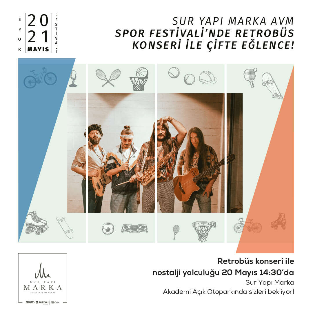Sur Yapı Marka AVM’nin artık geleneksel hale gelen spor festivali bu yıl Retrobüs konseriyle taçlanacak. 20-21 Mayıs tarihlerinde Sur Yapı Marka AVM bünyesindeki spor markalarının katılımıyla düzenlenecek festivalde ziyaretçiler, freestyle basket, paten, kaykay ve bisiklet show’larla coşacak.