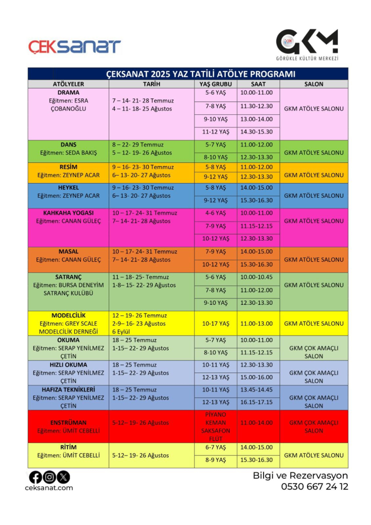 Her yaş grubuna özel gün ve saatlerde planlanan atölyelere kayıt için kontenjanlar sınırlı. Sanatın iyileştirici ve geliştirici gücüyle çocuklarınıza unutulmaz bir yaz armağan etmek isteyen aileler için detaylı program ve kayıt bilgileri: