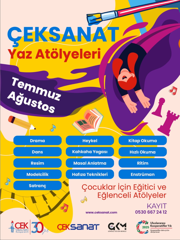 ÇEKSANAT, yaz boyunca çocukları sanatla buluşturacak birbirinden renkli atölyelere ev sahipliği yapıyor. Temmuz ve ağustos aylarında düzenlenecek “Yaz Atölyeleri” ile 4-17 yaş arası çocuklar, uzman eğitmenler eşliğinde sanat dolu bir deneyim yaşayacak.