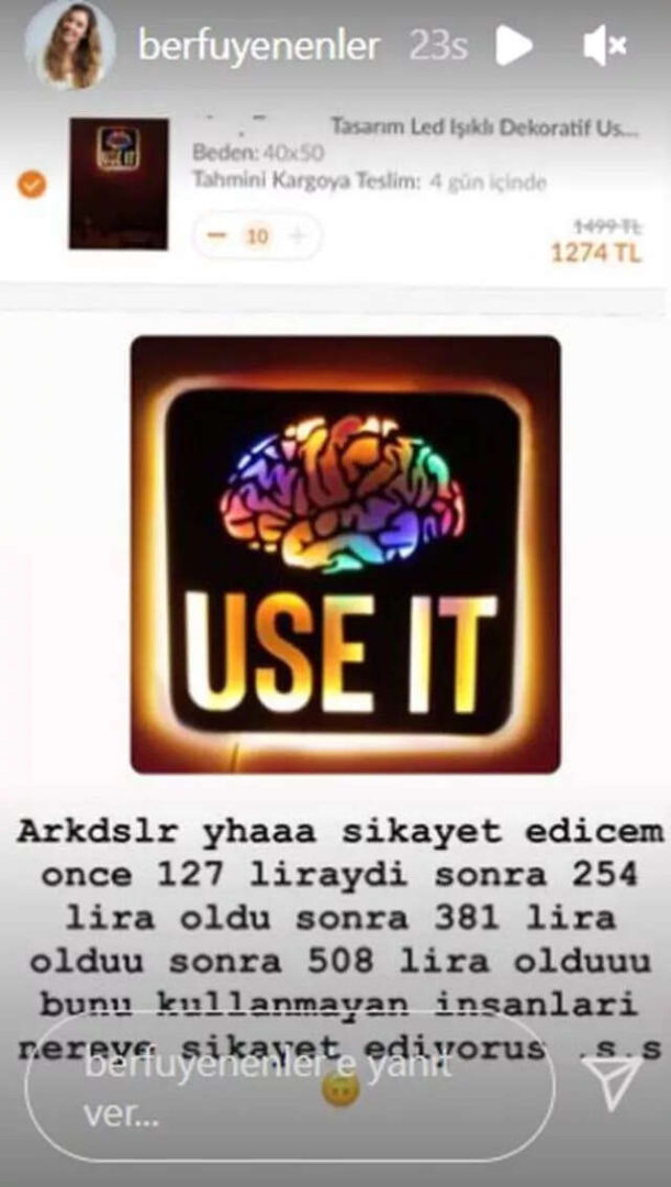 Berfu Yenenler, Akalın'ın buharlı ütü olayını anımsatarak instagram hesabından beyni kasteden ve "Use İt (Kullan)" yazan ürünlerden 10 adet sipariş verip "Arkdslr yhaaa sikayet edicem once 127 liraydi sonra 254 lira oldu sonra 381 lira olduu sonra 508 lira olduuu bunu kullanmayan insanlari nereye sikayet ediyorus .s.s" notuyla "beyinsiz" imasında bulundu.