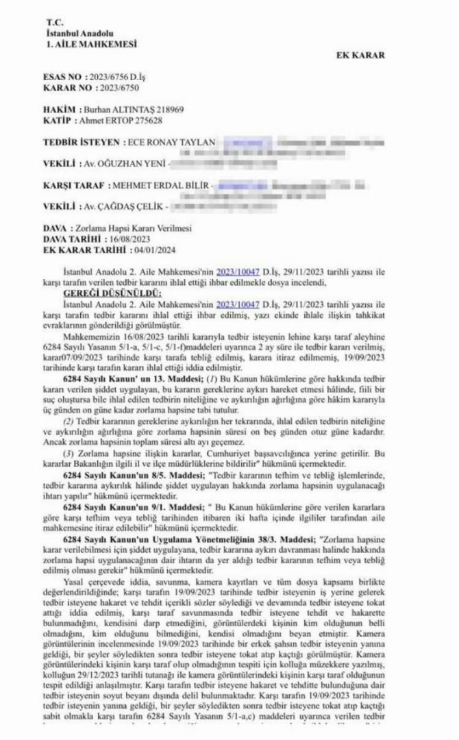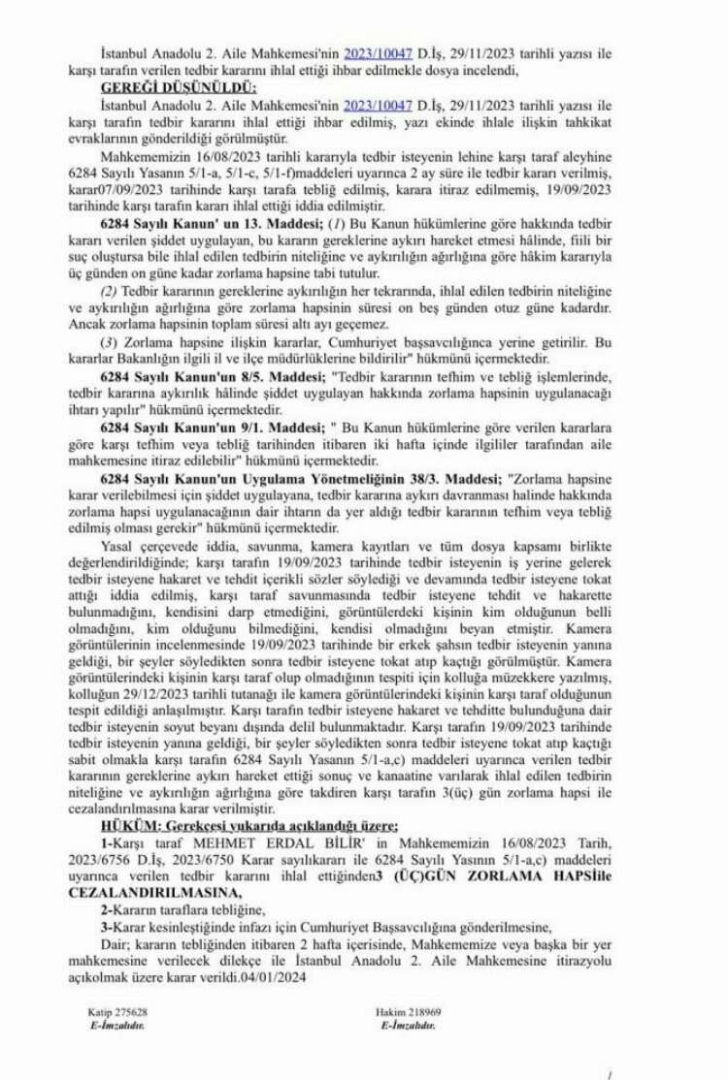 Ancak bugün Anadolu 1. Aile Mahkemesi görüntülerdeki şahsın Mehmet Bilir olduğunu tespit edip Bilir'i 3 gün tazyik hapis cezasına çarptırdı.