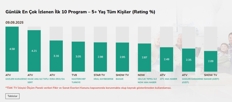 Televizyon İzleme Araştırmaları Kurumu (TİAK) tarafından açıklanan güncel verilere göre, Türkiye’de 5 yaş ve üzeri izleyiciler arasında en çok izlenen programlar sıralandı.