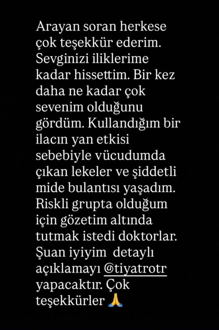 Riskli grupta yer aldığı için doktorların gözetim altında tutmak istediğini ifade eden Özkan, şu an sağlık durumunun iyi olduğunu duyurdu. Sanatçı, kendisine geçmiş olsun dileklerini ileten tüm sevenlerine teşekkür ederek, “Sevginizi iliklerime kadar hissettim. Bir kez daha ne kadar çok sevenim olduğunu gördüm” sözleriyle duygularını paylaştı.