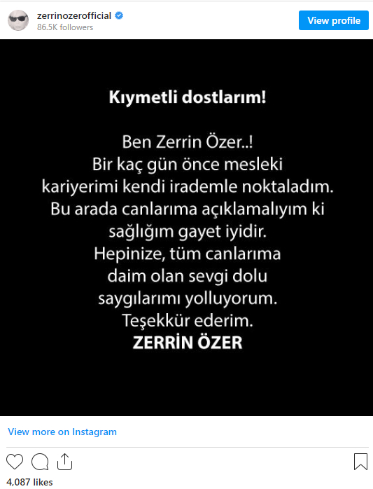 Zerrin Özer paylaşımında "Kıymetli dostlarım! Ben Zerrin Özer..! Birkaç gün önce mesleki kariyerimi kendi irademle noktaladım. Bu arada canlarıma açıklamalıyım ki sağlığım gayet iyidir. Hepinize, tüm canlarıma saygılarımı yolluyorum. Teşekkür ederim. Zerrin Özer" ifadelerini kullandı.