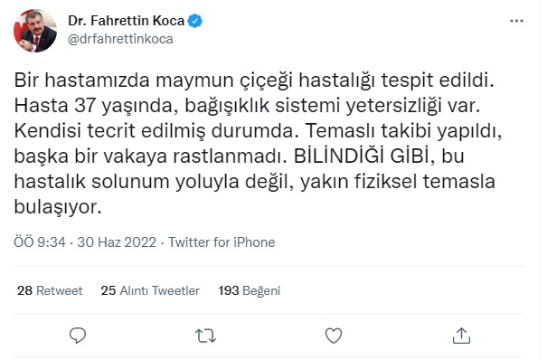 Bakan Koca sosyal medya hesabından yaptığı duyuruda, "Bir hastamızda maymun çiçeği hastalığı tespit edildi. Hasta 37 yaşında, bağışıklık sistemi yetersizliği var. Kendisi tecrit edilmiş durumda. Temaslı takibi yapıldı, başka bir vakaya rastlanmadı. BİLİNDİĞİ GİBİ, bu hastalık solunum yoluyla değil, yakın fiziksel temasla bulaşıyor" dedi.