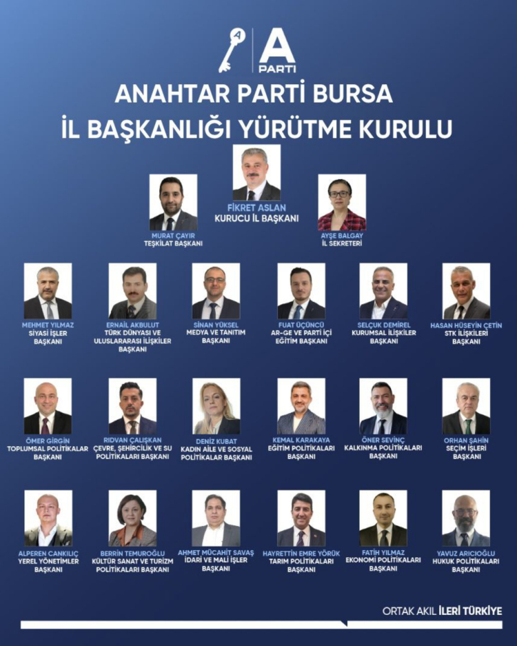 Yavuz Ağıralioğlu liderliğinde ‘Ortak Akıl, İleri Türkiye’ hedefiyle yola çıkan Anahtar Parti’nin Bursa teşkilatında il yürütme kurulu belli oldu.