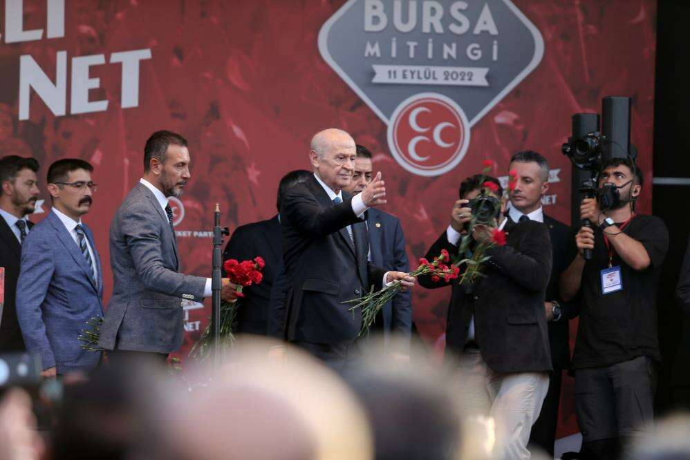 Milliyetçi Hareket Partisi (MHP) Genel Başkanı Devlet Bahçeli, ‘2023’e Doğru: Aday Belli, Karar Net’ temasıyla Bursa Gökdere Meydanı’nda on binlerce vatandaşa seslendi. Bahçeli, “Geçen hafta sonu Sivas muazzam bir açık hava toplantısına sahne oldu. On binlerce vatan evladı sel olup taştı, sağanak olup yağdı, bundan mülhem birilerinin de uykuları kaçtı. Kıskananların feleği şaştı, gözleri fal taşı gibi açıldı. 2023 yılında yapılacak Cumhurbaşkanı ve Milletvekili Genel Seçimlerinin ilk açık hava toplantısını Sivas’ta yaptık, siyasi kampanya döneminin meşalesini Sivas’tan yaktık.Huzurlarınızda Sivaslı kardeşlerimize, Amasyalı kardeşlerimize, Tokatlı kardeşlerimize, Çorumlu kardeşlerimize, Yozgatlı kardeşlerimize müteşekkir olduğumu ifade ediyorum. Geride kalan günlerde Sivas açık hava toplantımızı aklı eren de, ermeyen de, bilen de bilmeyen de, iyi niyetli olan da olmayan da devamlı konuştu, tartıştı. Bu ne ki, daha bir şey görmediler. Allah’ın izniyle, milletimizin takdiriyle gördükleri, göreceklerinin yanında devede kulak kalacak. Turpun büyüğünün heybede olduğuna 2023 yılında mecburen tanık olacaklar. İlk açık hava toplantımızdan sonra zillete düşen odakları korku dağları sardı. Türkiye’ye diş bileyen mihraklar kabusla tanıştı. Sokak röportajlarıyla Cumhur İttifakını kötüleyip zillete methiye düzenler, sosyal medya kanalıyla algı düzenekleri kuranlar küçük dillerini yuttular. Türkiye’nin kendilerinden ibaret olmadığını çok açık idrak etmek zorunda kaldılar. Sadece kimyaları değil, matematikleri de bozuldu, bütün hesapları ters yüz oldu. Milliyetçi Hareket Partisi’ni küçümseme ve küçük görme yanlışına düşen soytarılara diyorum ki, cesaretiniz varsa Sivas’tan sonra gelin de Bursa’ya bir bakın. Bakın da vatan sevdası nedir, bayrak sevdası nedir görün Üç hilalin bariyerleri nasıl yıkıp geçtiğine şahit olun” dedi.