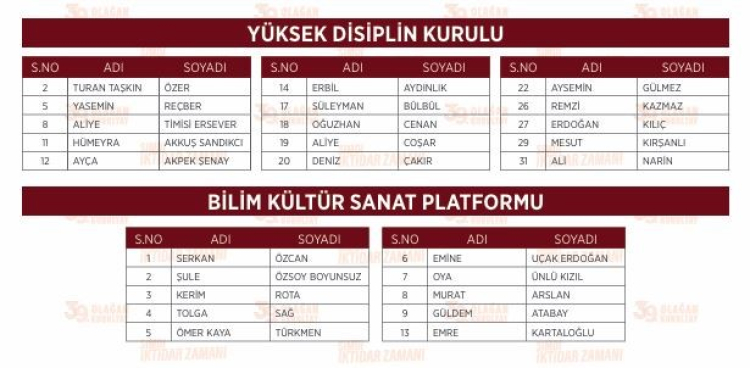 Bilim Kültür Sanat Platformu için ise anahtar listede; Serkan Özcan, Şule Özsoy Boyunsuz, Kerim Rota, Tolga Sağ, Ömer Kaya Türkmen, Emine Uçak Erdoğan, Oya Ünlü Kızıl, Murat Arslan, Güldem Atabay ve Emre Kartaloğlu yer aldı.