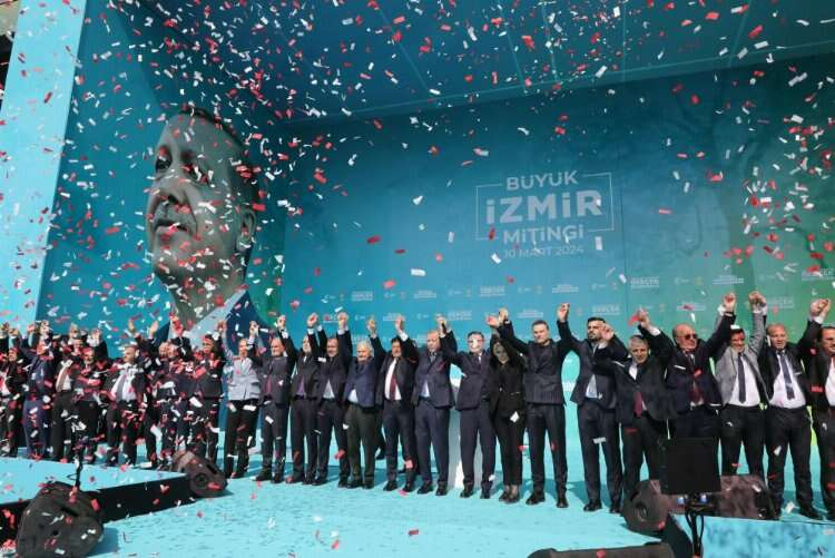 Cumhurbaşkanı Recep Tayyip Erdoğan, 31 Mart Yerel Seçimleri öncesi İzmir Gündoğdu Meydanı’nda ‘Büyük İzmir Mitingi’ gerçekleştirdi. Dev mitingde önemli mesajlar veren Erdoğan, sahneye Sanatçı Cengiz Kurtuoğlu ile çıkarak ‘Duyanlara Duymayanlara’ şarkısını söyledi. Binlerce vatandaşa seslenen Erdoğan, İzmir’e yapılan hizmetlerden bahsederek, “Kardeşlerim demir yollarında İzmir sınırları içindeki konvansiyonel hattı yeniledik. Aliağa-Selçuk arasındaki İZBAN’ı, Kemalpaşa Organize Sanayi Bölgesi'ne demir yolu bağlantı hattını bitirdik. İzmir, Ankara Yüksek Hızlı Tren hattının yapımına etaplar halinde devam ediyoruz. Halkapınar Otogar raylı sistem hattını ihale aşamasına getirdik. Adnan Menderes Havalimanı'nı baştan aşağı yenileyerek yolcu sayısını 5 katına çıkardık. 20 yıl önce Adnan Menderes Havalimanı'nın halini düşünün, neydi? Ama biz geldik ne oldu? Mordoğan, Eski Foça ve Güzelbahçe Yalı Balıkçı barınaklarını Sığacık, Çeşme ve Yeni Foça yat limanlarını tamamladık. Tarım ve Ormanda son 21 yılda şehrimize 38 baraj, 7 içme suyu tesisi, 44 sulama tesisi, 109 taşkın koruma tesisi, 8 gölet ve 8 yeraltı depolama tesisi yaptık. İzmir'de 94 bin dekar arazinin sulanmasına hizmet edecek olan 5 baraj daha inşa ediyoruz. Bitirdiğimiz sulama tesisleriyle 500 bin dekar araziyi sulamaya açtık. Çiftçilerimize yıllık 3 milyar 750 milyon lira zirai gelir artış sağladık. İnşaat safhasında yer alan 4 sulama tesisimizde 115 bin dekar araziyi daha sulayacağız. İzmirli çiftçilerimize bugüne kadar yaklaşık 64 milyar lira tutarında tarımsal hibe desteği verdik. Sanayi ve teknolojide 4 yeni organize sanayi bölgesi, 3 endüstri bölgesi, 4 teknopark kurduk. Dikili, Bayındır ve Kınık Sera Organize Tarım Bölgelerimizin yapımına devam ediyoruz. Bu 3 Sera Organize Tarım Bölgesi tamamlanıp faaliyete geçtiğinde çoğu kadın olmak üzere 8 bin kişiye ilave iş imkanı sağlayacak. İstihdamı desteklemek için İzmir'deki işverenlere 30 milyar lira prim teşviği verdik. Enerjide yaklaşık 1 milyon abonesi bulunan İzmir'de nüfusun yüzde 91’ine doğal gaz imkanı sunduk. Bu yıl Çeşme'ye ve 2026 yılında Karaburun'a da doğal gaz arzı planlıyoruz” ifadelerine yer verdi.