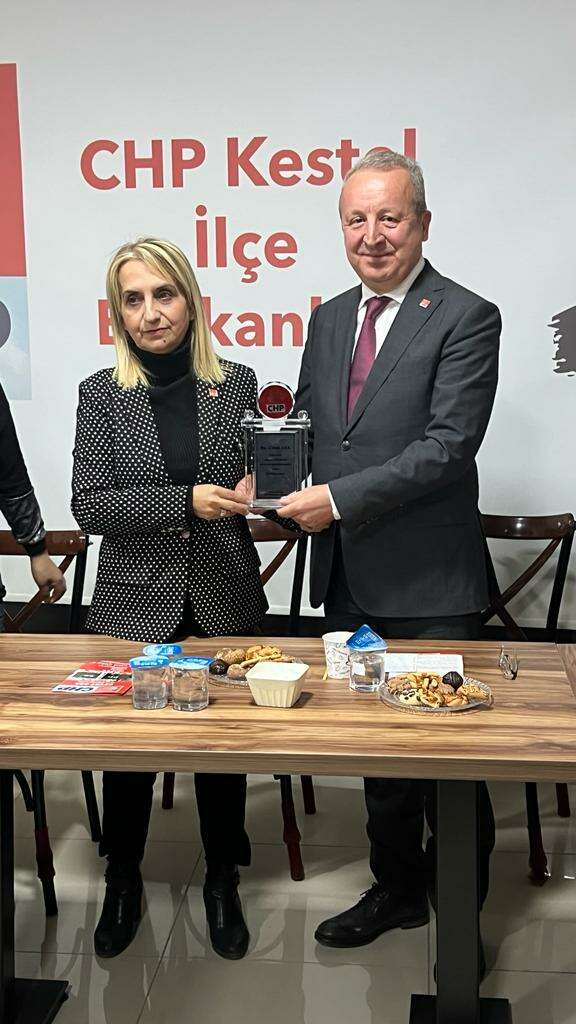 Cumhuriyet Halk Partisi Kestel İlçe Başkanı Hatice Doğan, geçtiğimiz gün partiyi ziyaret eden CHP Bursa 2. Bölge Milletvekili Aday Adayı Cevat Asa’ya, partiye yaptığı katkı ve desteklerinden dolayı plaket verdi.